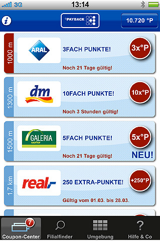 Die App hat den gleichen Funktionsumfang, soll gleichzeitig auch anzeigen können, welche naheliegenden Geschäfte den Paybackpunkteservice anbieten.