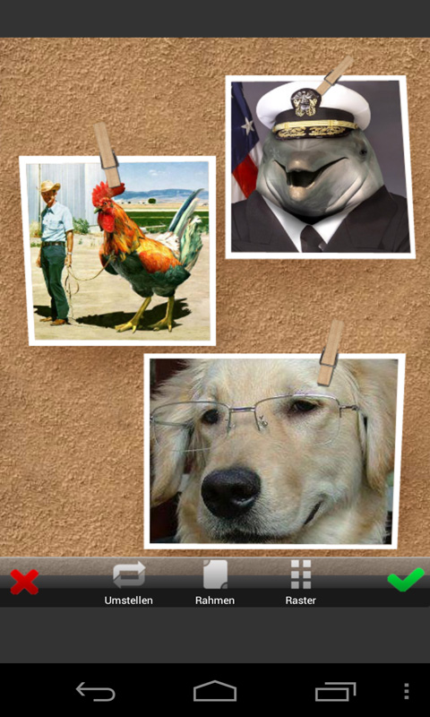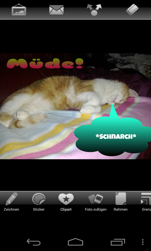 Neben den üblichen Möglichkeiten, ein Bild u.a. auf Facebook und Co. zu posten, kann diese App auch -wer hätte es gedacht 😀 – Bilder bearbeiten. Das heißt, man kann Bilder mit einem lustigen Text versehen, mit sog. „Cliparts“ die Bilder aufpeppen, Effekte wie „Alterung“, Sepa und Solarisieren sind nur einige der Effekte, die man beispielsweise auch direkt mit der Kamera verwenden kann.