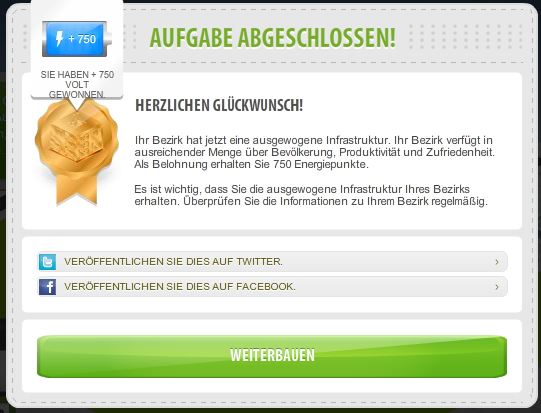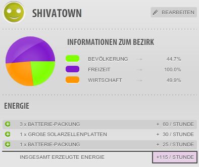 Mit dem „i“ Informationsbutton sieht man nicht nur den Namen seines Bezirks, sondern auch, ob und wie der Bezirk ausgeglichen ist. Auch die erzeugte Energie pro Stunde lässt sich hier auf einen Blick einsehen.