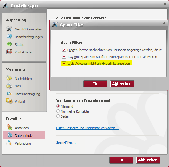 Was kann man tun? Mann kann die Vorschau zwar nicht deaktivieren, aber zumindest kann man ICQ 7 sagen, das die geposteten Links nicht als Hyperlinks angezeigt werden.