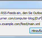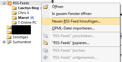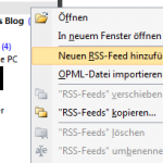 Zunächst Outlook öffnen und links am Rand den RSS Feeds-Ordner mit rechts anklicken und „Neuen RSS hinzufügen“ wählen.