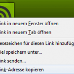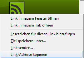 Danach zur gewünschten Internetseite wechseln und mit der rechten Maustaste das RSS Logo anklicken (meist ist es in Logo oder Counter-Form dargestellt) und „Link-Adresse kopieren“ auswählen.