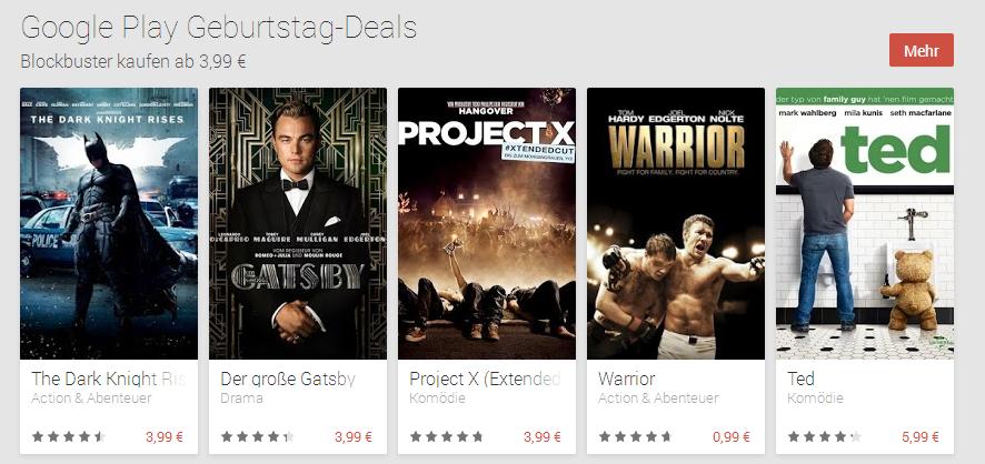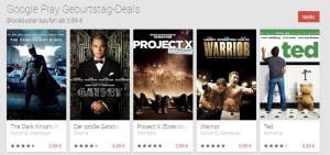 Weiterhin gibt’s die Google Play Geburtstagsdeals in Form von (mehr oder minder aktuellen) Blockbustern ab 3,99 Euro. Wahlweise in SD oder natürlich auch HD. Mit dabei u.a. „The Dark Knight Rises“, „Projekt X“ und „Real Steel“.