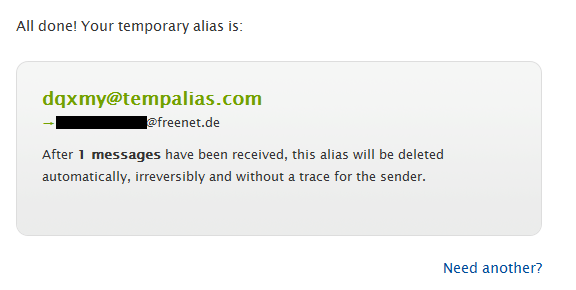 Sind alle Daten ausgefüllt, bekommt man eine Bestätigungsemail mit der angegebenen Aliasadresse und dem Hinweis, dass die erstellte temporäre E-Mailadresse nach der angegebenen Zeit gelöscht wird.