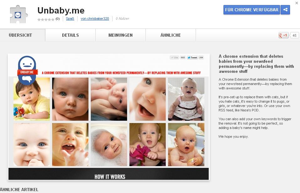 Und genau deshalb gibt es nun für Chrome eine Erweiterung namens „unbaby.me“. Damit ist es möglich, alle Babyfotos aus Facebook und aus dem Newsfeed zu entfernen!